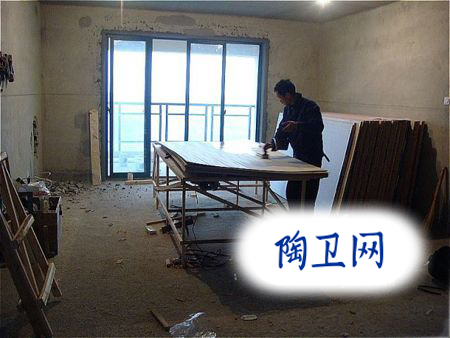 這是客廳到陽臺的墻沒鑿之前的樣子,師傅正在給板子刷清漆。