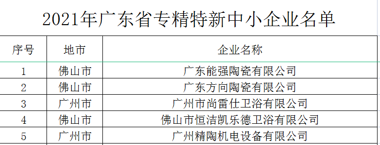 1月5日,廣東省工業和信息化廳公布2021年廣東省專精特新中小企業名單,1459家企業獲認定。其中,廣東能強陶瓷有限公司、廣東方向陶瓷有限公司、廣州市尚雷仕衛浴有限公司、佛山市恒潔凱樂德衛浴有限公司、廣州精陶機電設備有限公司等5家陶瓷衛浴及相關企業上榜。