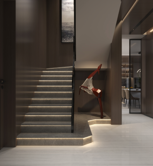 餐廳以奢石圓桌和皮質餐椅為主,用深色調打造復古知性的氛圍,開放式廚房將光線引入,擺脫了原廚房的封閉感,尤其地面奢石的運用,會給人歲月的沉淀感。樓梯不僅能承擔著中轉的作用,奢石階梯也飽含著藝術的雋永,延續(xù)著素雅的配色,奢石紋理自帶高級貴氣的場域。