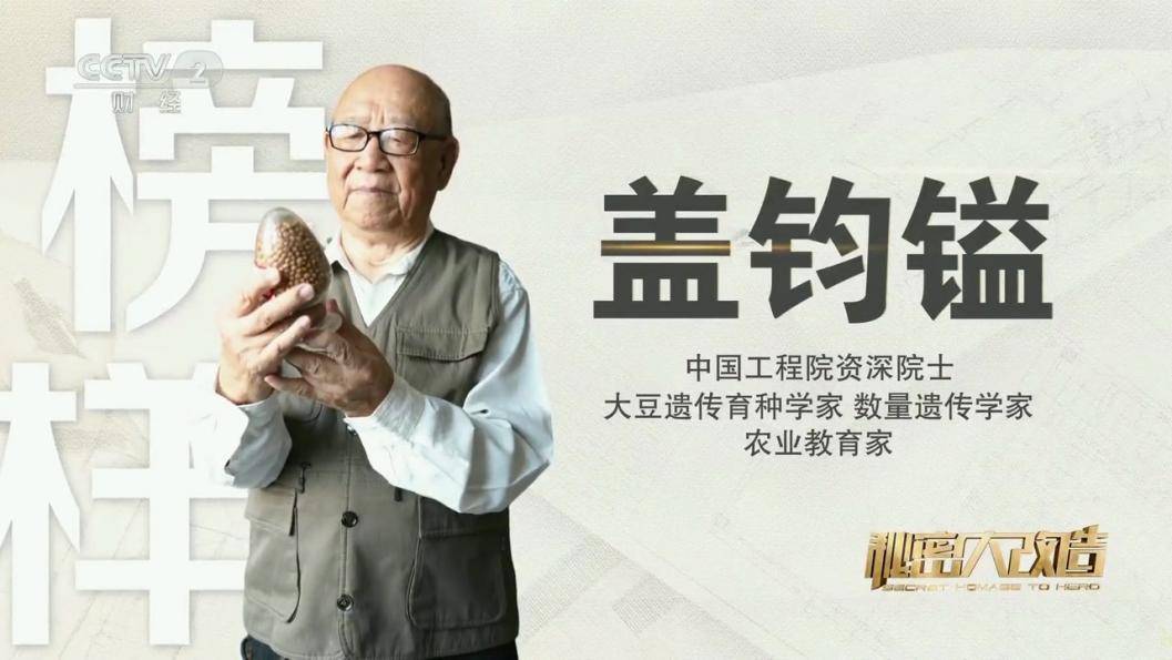 一生擇一事,惟愿“豆?jié)M倉”第二期 榜樣人物 “大豆院士”蓋鈞鎰大豆陪伴了中國(guó)4000多年。我們每個(gè)人的餐桌上,離不開大豆?!拔覀儕^斗的目標(biāo),就是實(shí)現(xiàn)中國(guó)人的飯碗掌握在自己手里?!薄按蠖乖菏俊鄙w鈞鎰,是中國(guó)工程院的資深院士,66年投身大豆科研事業(yè),為了“中國(guó)碗里裝中國(guó)糧”,將畢生心血傾注于大豆科研事業(yè),帶領(lǐng)團(tuán)隊(duì)建成了世界第三大大豆種質(zhì)綜合性狀數(shù)據(jù)庫,并育成了