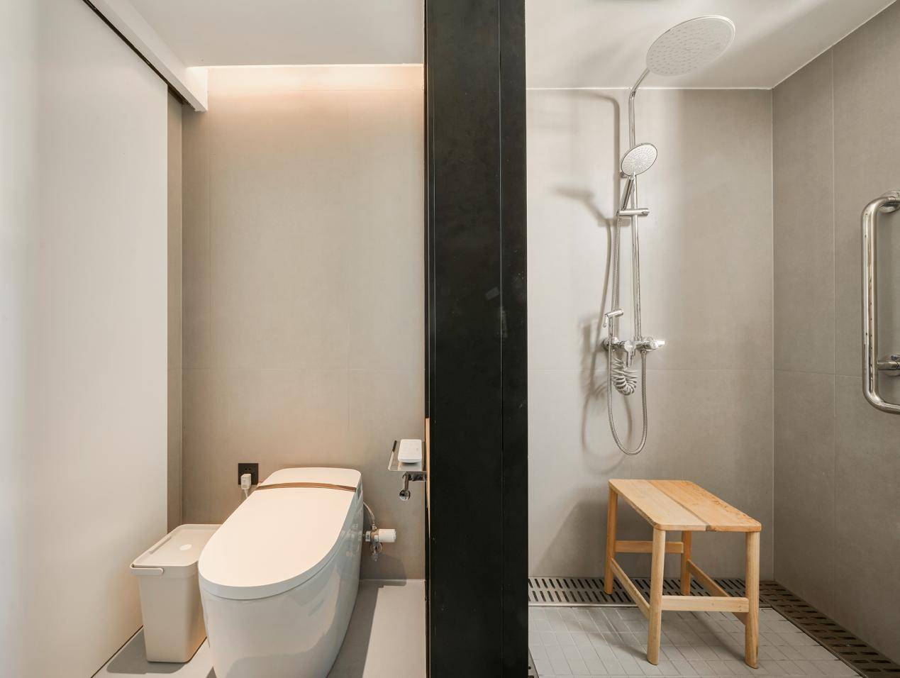 設(shè)計(jì)師對(duì)新房衛(wèi)生間重新布局,借用廚房的一小部分空間,將洗手臺(tái)嵌入墻體,合理劃分出衛(wèi)生間的洗漱區(qū),讓出足夠的空間給如廁區(qū)和淋浴區(qū),并選用鷹衛(wèi)浴智能坐便器、大頂噴花灑,貼心安裝了扶手,不僅有效做到干濕分離,帶來健康舒適的衛(wèi)浴體驗(yàn),最大化滿足了老年人的生活需求。
