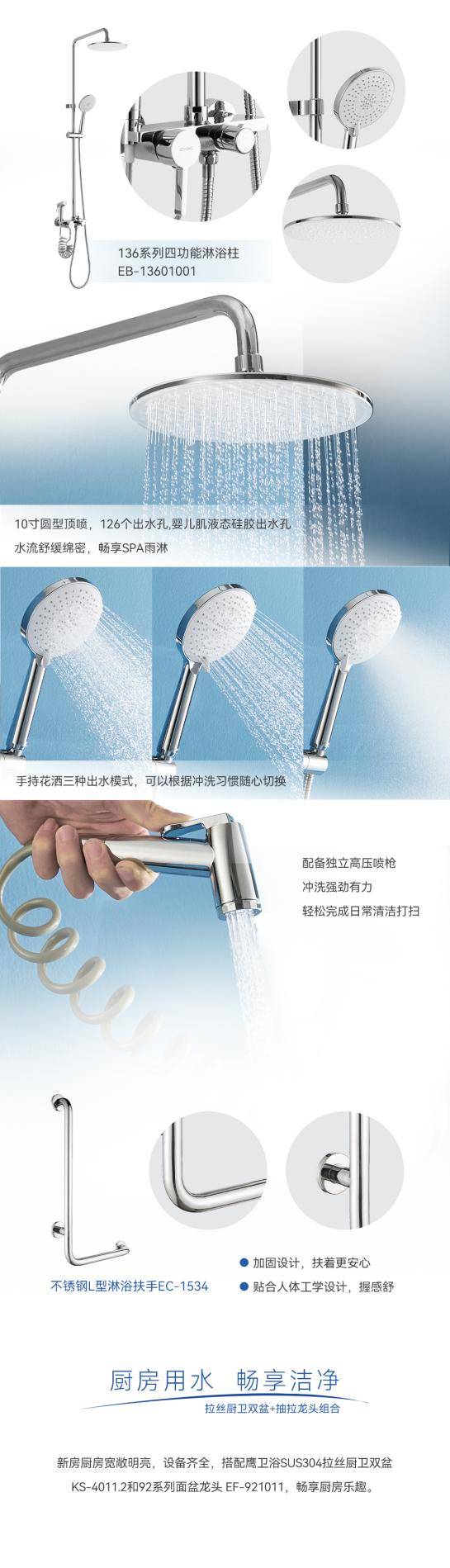 淋浴區(qū)安裝的無軌移門實(shí)現(xiàn)了地面的無障礙設(shè)計(jì),既實(shí)現(xiàn)干濕分離,又方便淋浴。精心選配136系列四功能淋浴柱EB-13601001,并貼心裝上L型淋浴扶手,帶來安全舒適淋浴體驗(yàn)。