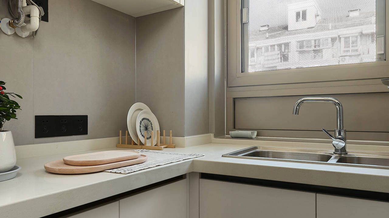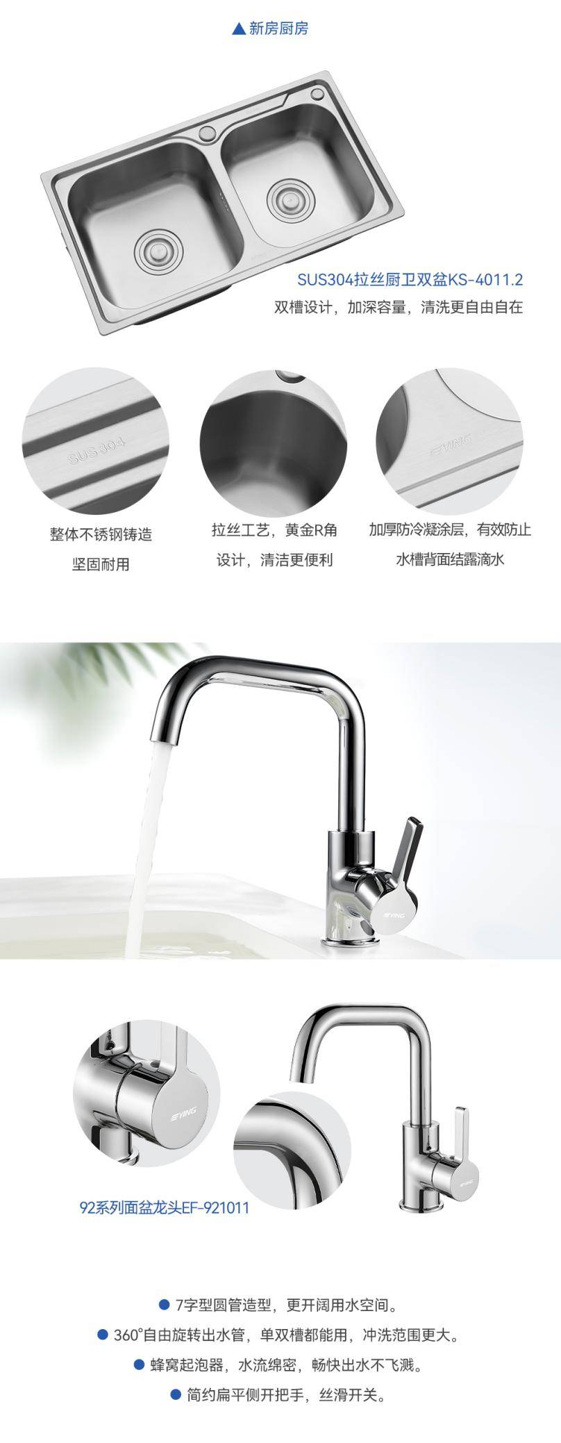 新房廚房寬敞明亮,設(shè)備齊全,搭配鷹衛(wèi)浴SUS304拉絲廚衛(wèi)雙盆KS-4011.2和92系列面盆龍頭EF-921011,暢享廚房樂趣。