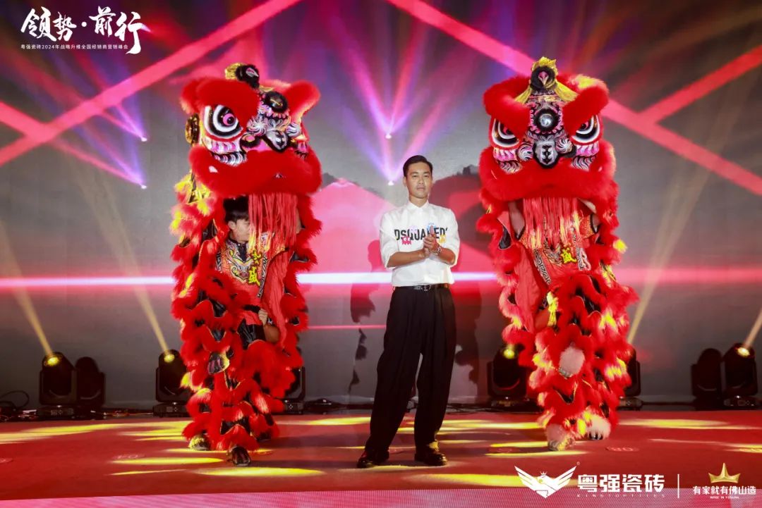 晚宴環節,粵強品牌代言人陳國坤先生驚喜現身,引發全場歡呼,并與舞獅團隊共同表演,把會議氛圍拉上新一輪高潮。