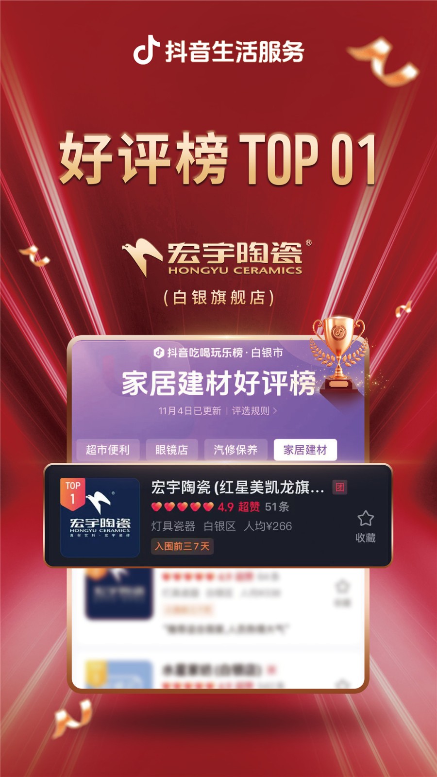 宏宇陶瓷“千城霸榜行動(dòng)計(jì)劃”強(qiáng)勢(shì)來(lái)襲,席卷全國(guó)。雙11狂歡購(gòu)活動(dòng)期間,宏宇陶瓷全國(guó)多地門(mén)店在激烈的市場(chǎng)競(jìng)爭(zhēng)中持續(xù)保持強(qiáng)勁勢(shì)頭,一舉奪魁,榮登抖音同城家居建材好評(píng)榜榜首,成為眾多消費(fèi)者信賴(lài)的首選品牌。