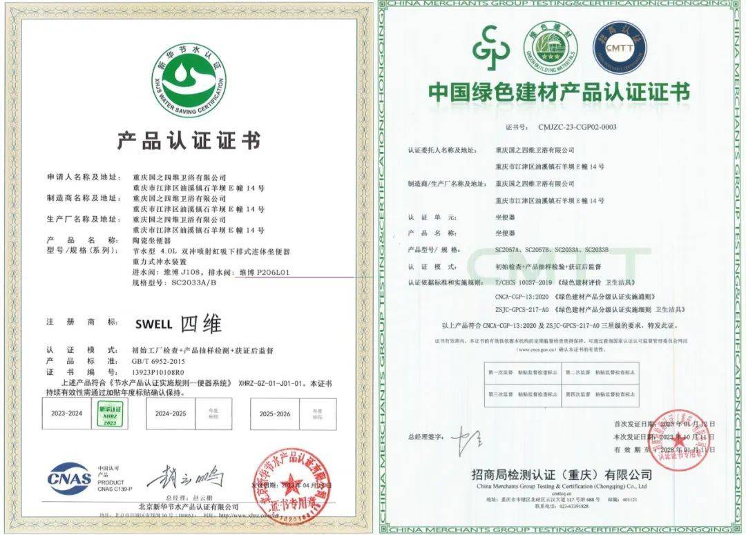 除了金獎的榮耀,四維還擁有一系列國內(nèi)外權(quán)威認(rèn)證的加持,包括綠色建材認(rèn)證、節(jié)水認(rèn)證、ISO45001安全體系證書、ISO9001質(zhì)量證書等。這些認(rèn)證不僅是對四維在品質(zhì)管理、安全管理及環(huán)保節(jié)能方面卓越成就的認(rèn)可,更是對四維在全球市場競爭力的有力證明。我們始終將環(huán)保、健康、安全作為產(chǎn)品設(shè)計(jì)的核心理念,致力于為消費(fèi)者提供高品質(zhì)、高性能的衛(wèi)浴解決方案。
