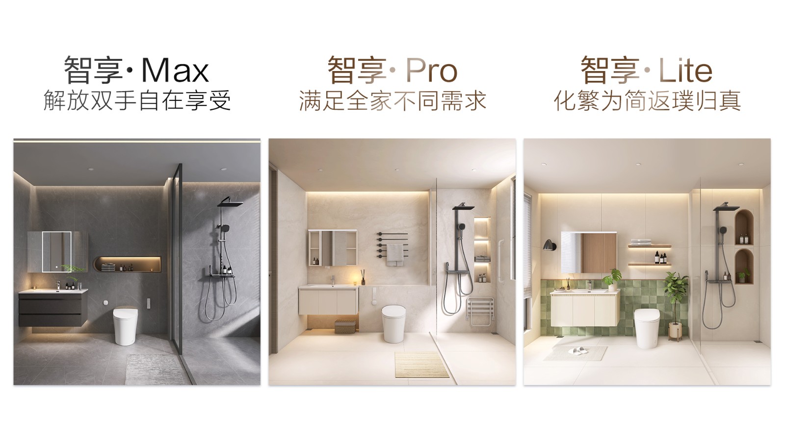 以套系化設(shè)計(jì)為核心,重磅推出三大「智」愈空間,以多樣產(chǎn)品組合匹配不同人群需求。套間內(nèi)包含行業(yè)爆款舒沐洗H5Pro智能馬桶、口碑爆款H35Pro的升級力作——全新H36Max智能馬桶、以及HQ606輕智能馬桶,三大單品按需選購,更搭配了高顏值美妝智能鏡柜與鋼琴鍵花灑,實(shí)現(xiàn)功能與美學(xué)的雙重升級。